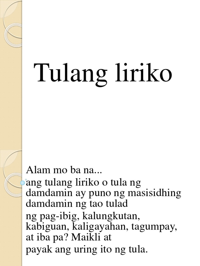 2272015 Read Mga Uri ng Tulang Liriko from the story Grade 10 Filipino Module by fckdmpd Gwyneth Antonio with 44375 readsHi guys. Nasa kategorya nito ang awiting bayan soneto elehiya dalit pastoral at odaHalimbawa ng tulang liriko o pandamdamin.