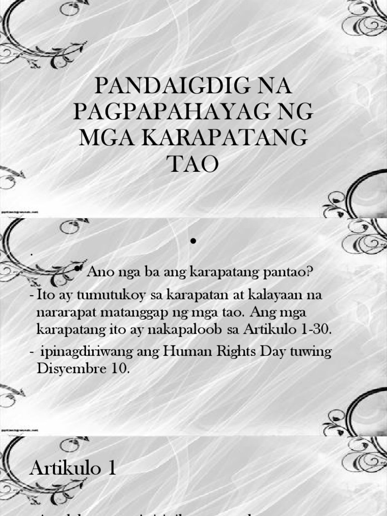 Ang Panukalang Batas ng mga Karapatan Ingles. 20052015 ARTIKULO 25 Ang bawat taoy may karapatan sa isang pamantayan ng pamumuhay na sapat para sa kalusugan at kagalingan ng kanyang sarili at ng kanyang pamilya kasama na ang pagkain pananamit paninirahan at pagpapagamot at kinakailangang mga paglilingkod panlipunan at ng karapatan sa kapanatagan sa panahong walang gawain pagkakasakit pagkabalda. Ang ating mga karapatan ay mga bagay o gawaing ipinagkaloob sa isang tao.